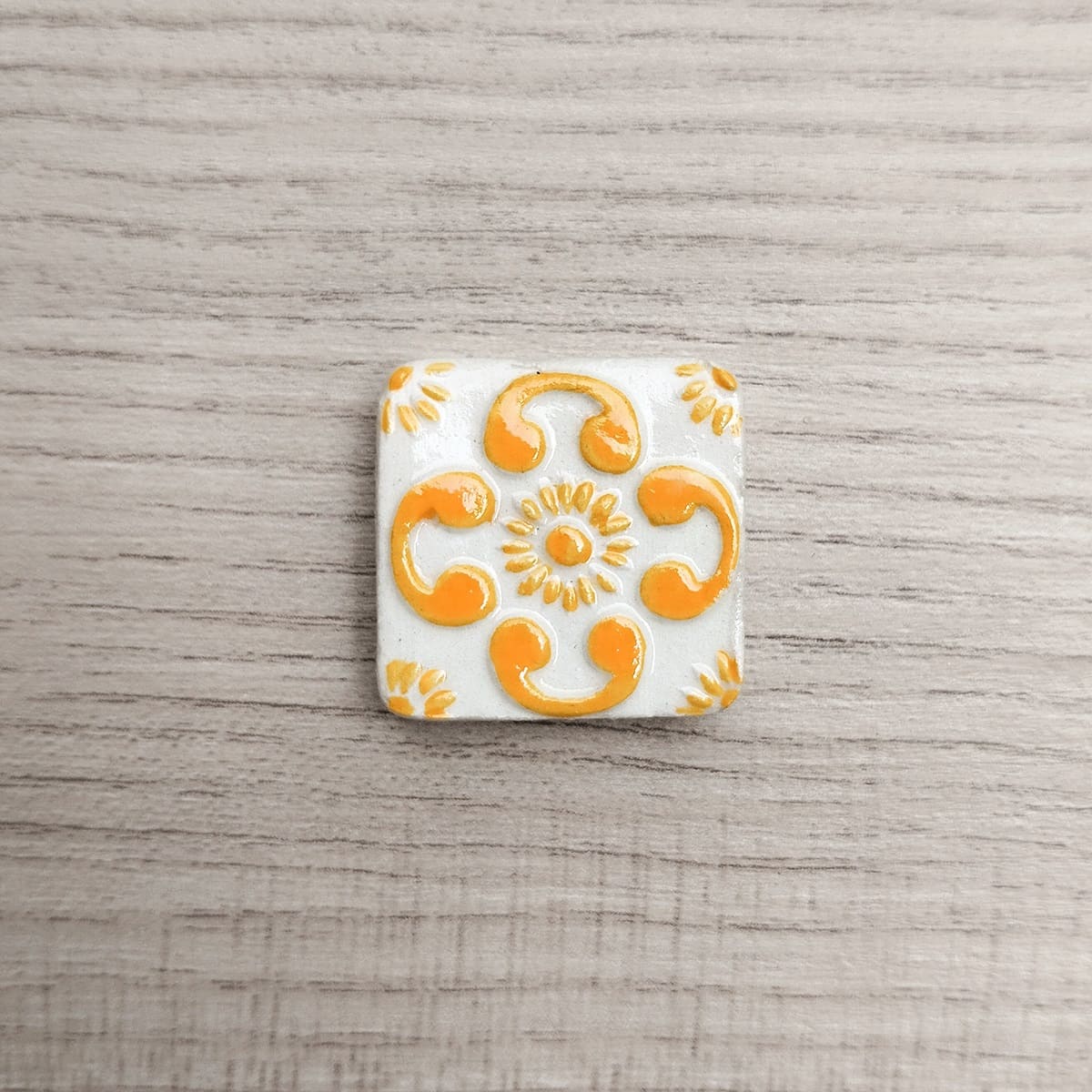 La decorazione della calamita Caltagirone è in rilievo, dipinto a mano e protetto da una vernice trasparente che dona un effetto liscio e lucido, simile al vetro.